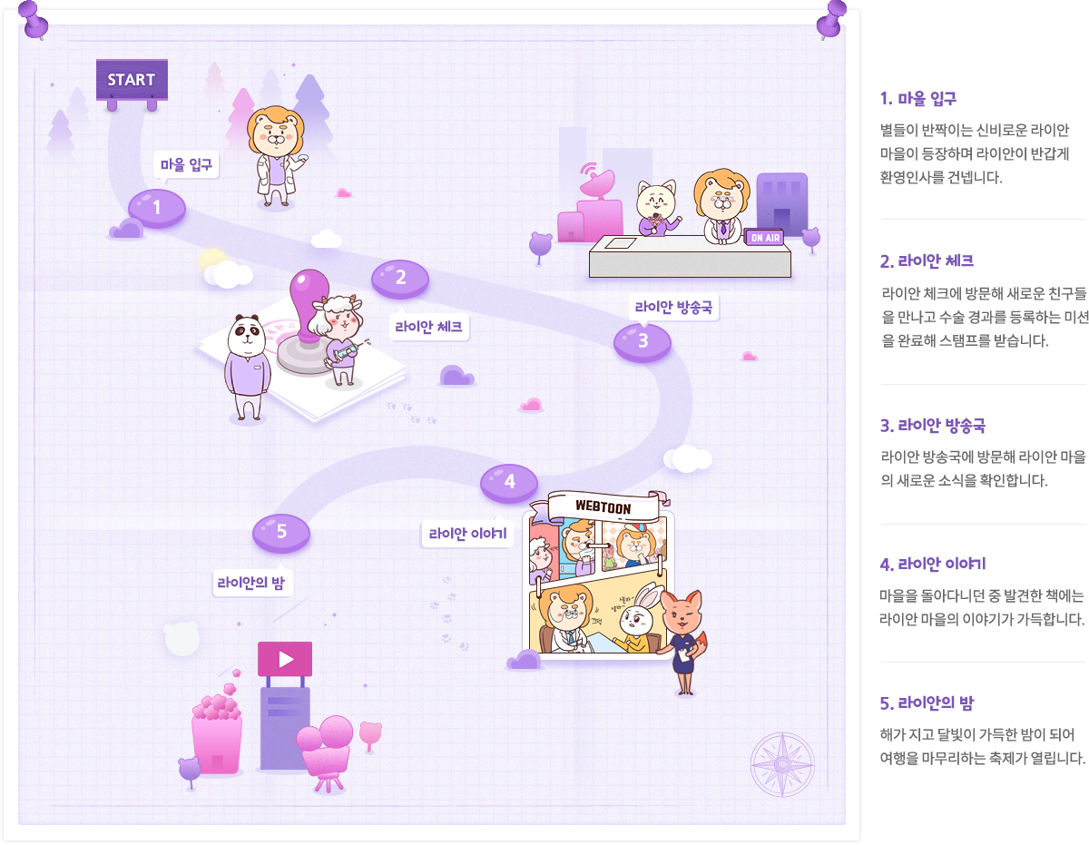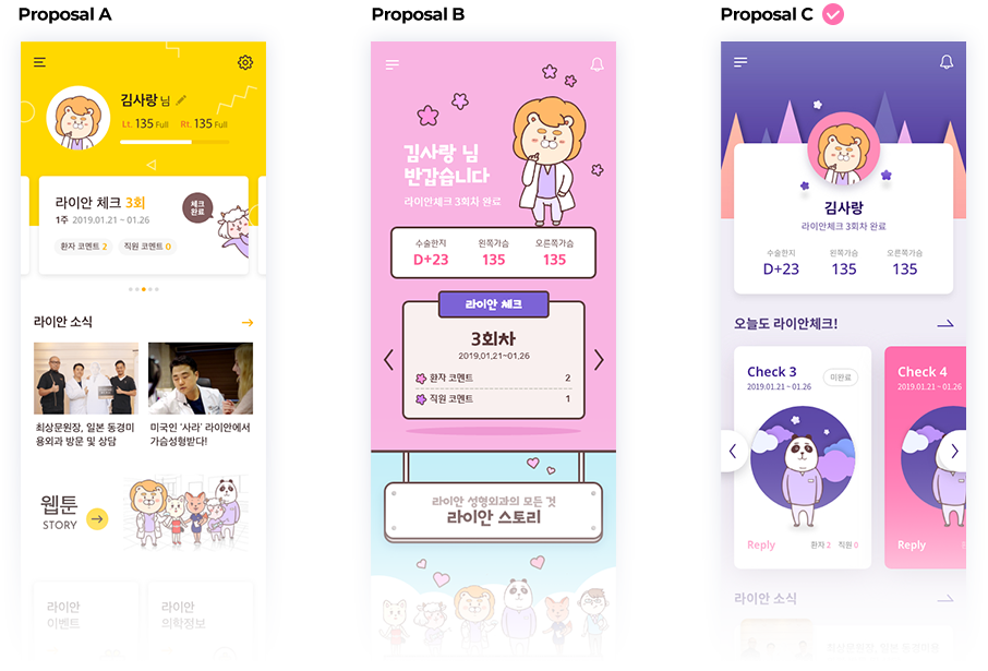 A안은 밝은 옐로 컬러를 사용하여 심플하게 구성한 시안, B안은 사용자에게 즐거움을 주기 위해 게임화면을 모티프로 하여 구성한 시안, C안은 동물 캐릭터들이 살고 있는 숲을 모티프로 하여 구성한 시안입니다. 우리는 C안의 퍼플&핑크 조화가 캐릭터와 잘 어우러지면서도 디벨롭을 통해 더 유쾌한 스토리를 담을 수 있을 것이라고 판단하였습니다.