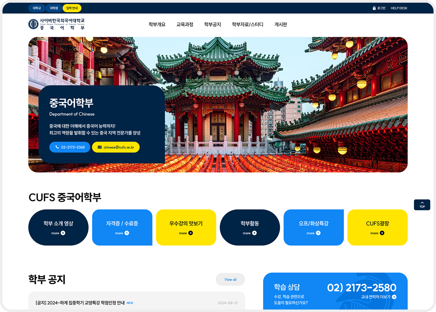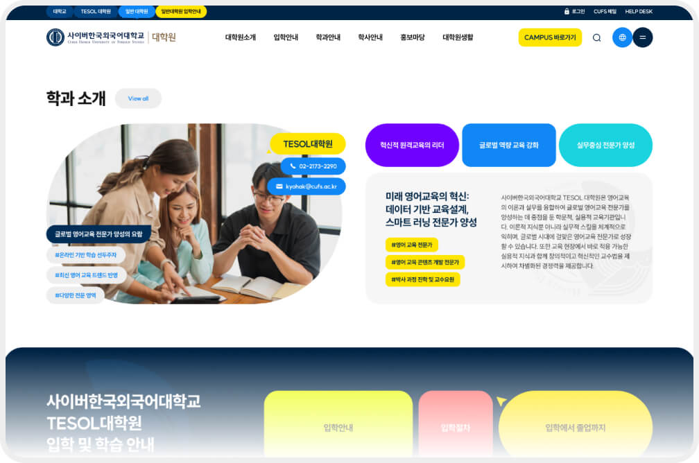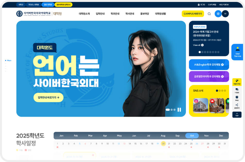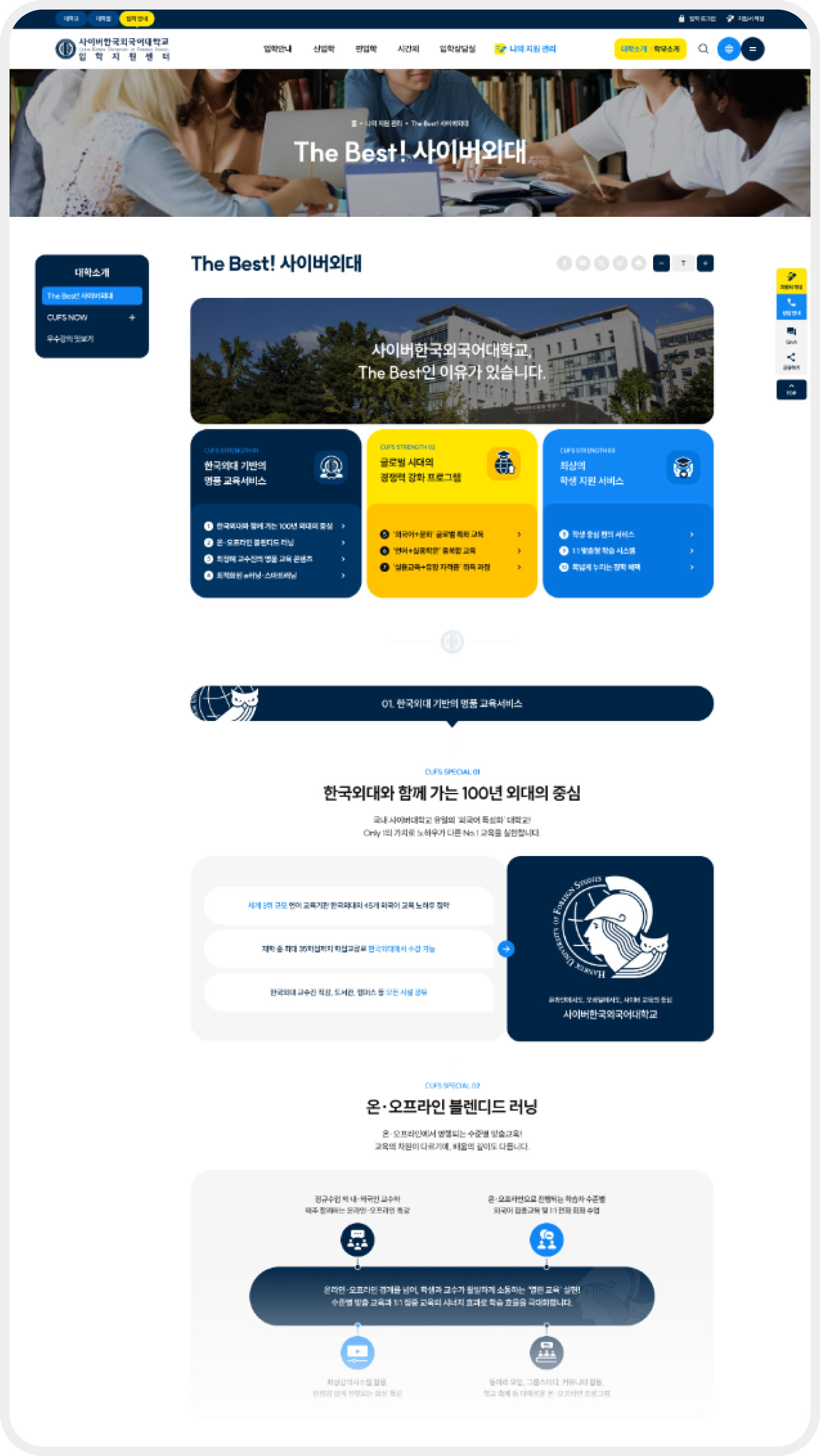 더 따뜻하고 친근한 이미지로 다가가고 싶어요.기존 사이트 간 디자인 편차를 줄이고, 사이버한국외대만의 브랜드 톤을 유지하고 싶어요.